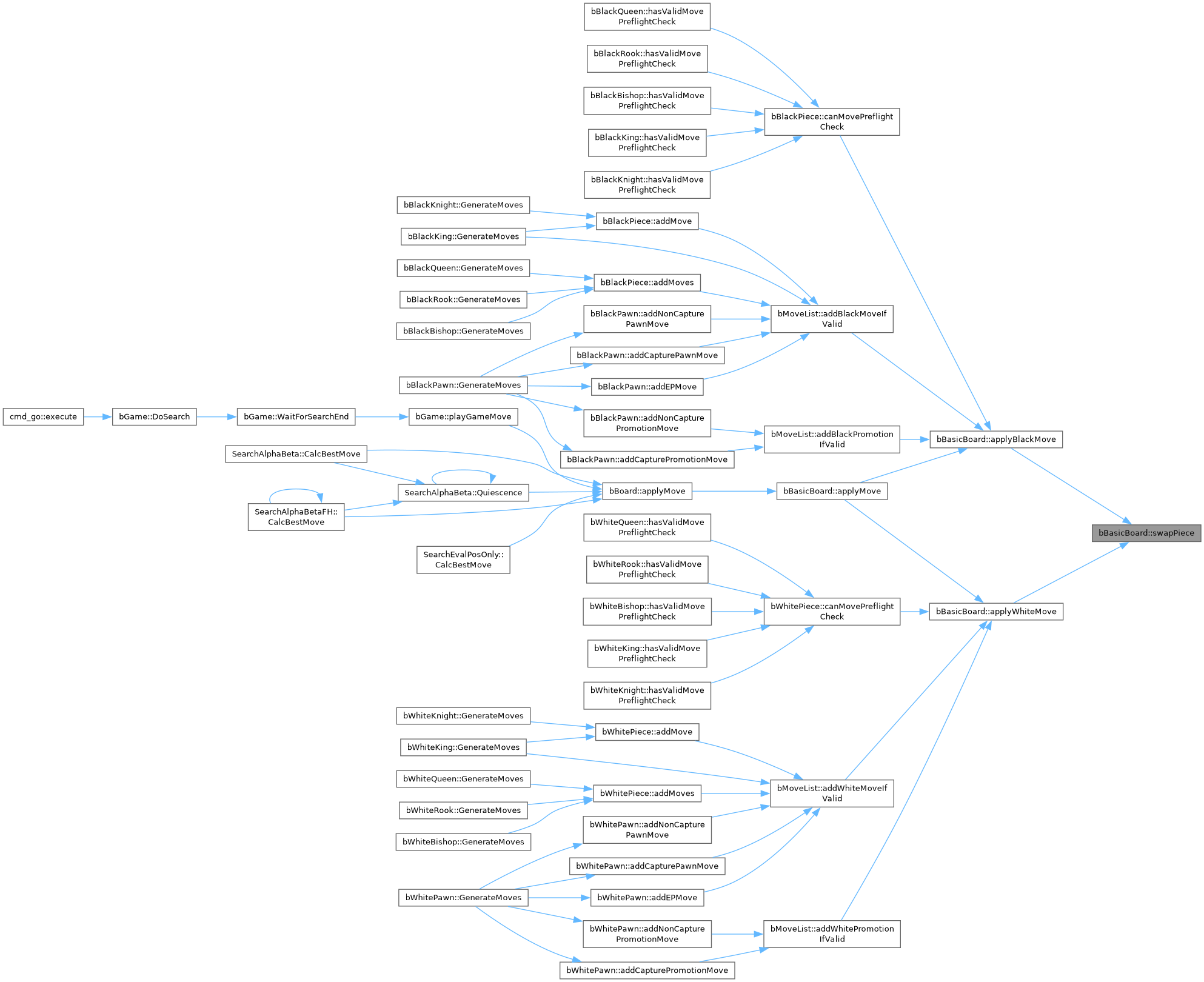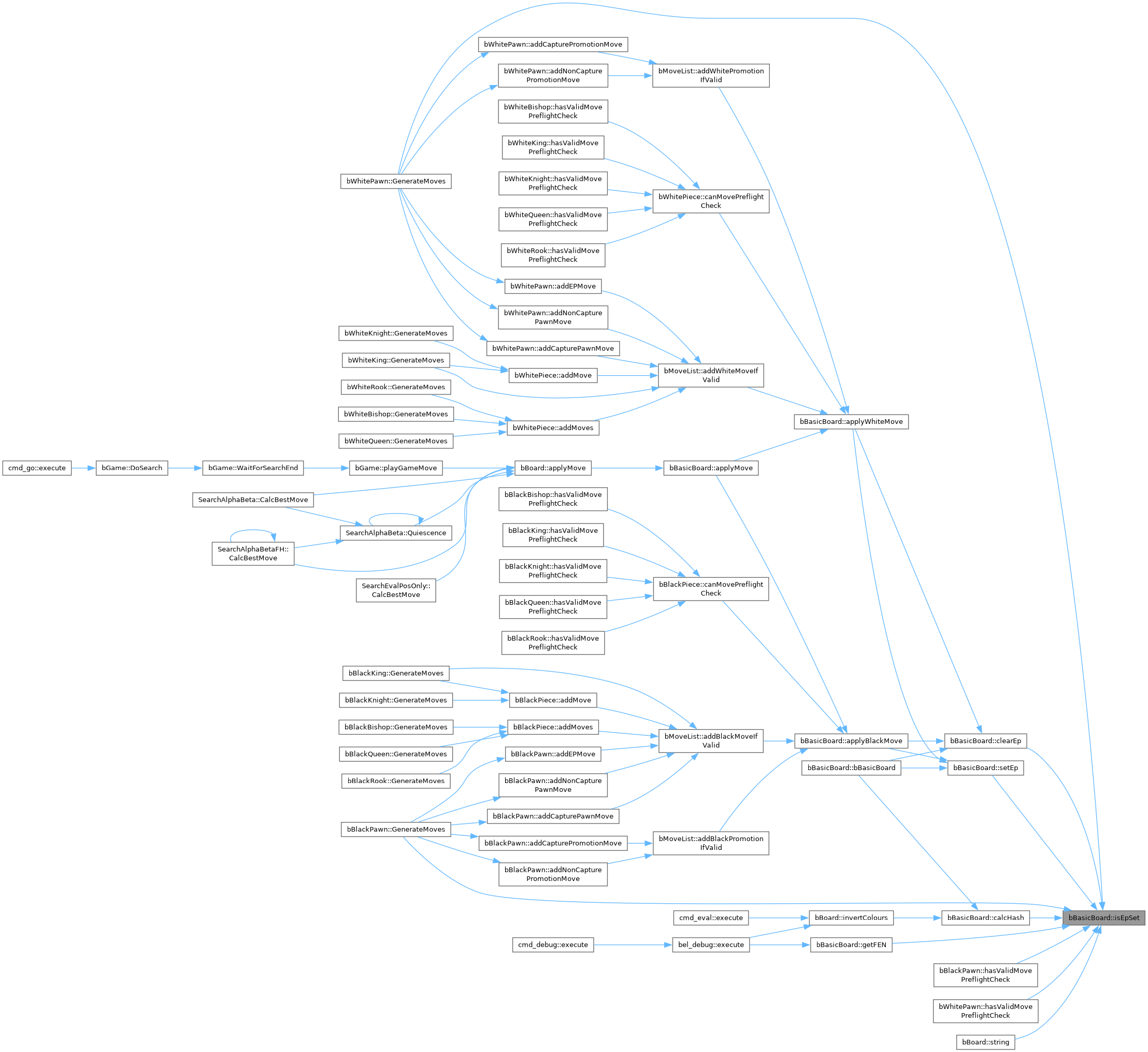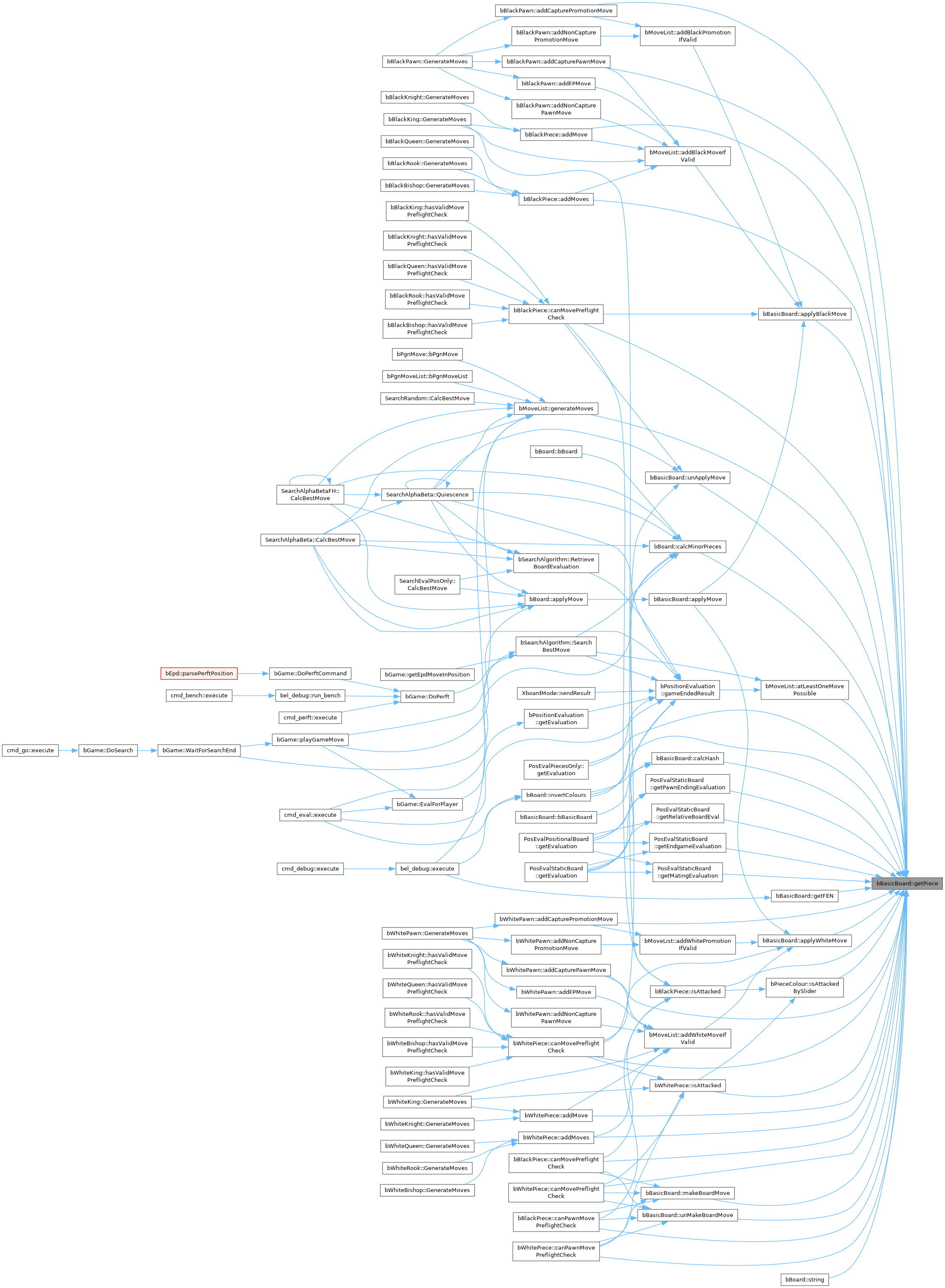 Referenced by bBlackPawn::addCapturePawnMove(), bWhitePawn::addCapturePawnMove(), bBlackPawn::addCapturePromotionMove(), bWhitePawn::addCapturePromotionMove(), bBlackPiece::addMove(), bWhitePiece::addMove(), bBlackPiece::addMoves(), bWhitePiece::addMoves(), applyBlackMove(), applyWhiteMove(), bMoveList::atLeastOneMovePossible(), calcHash(), bBoard::calcMinorPieces(), bBlackPiece::canMovePreflightCheck(), bBlackPiece::canMovePreflightCheck(), bWhitePiece::canMovePreflightCheck(), bWhitePiece::canMovePreflightCheck(), bBlackPiece::canPawnMovePreflightCheck(), bWhitePiece::canPawnMovePreflightCheck(), bMoveList::generateMoves(), PosEvalStaticBoard::getEndgameEvaluation(), PosEvalPiecesOnly::getEvaluation(), getFEN(), PosEvalStaticBoard::getMatingEvaluation(), PosEvalStaticBoard::getPawnEndingEvaluation(), PosEvalStaticBoard::getRelativeBoardEval(), bBoard::invertColours(), bBlackPiece::isAttacked(), bWhitePiece::isAttacked(), bPieceColour::isAttackedBySlider(), makeBoardMove(), bBoard::operator std::string(), unApplyMove(), and unMakeBoardMove().