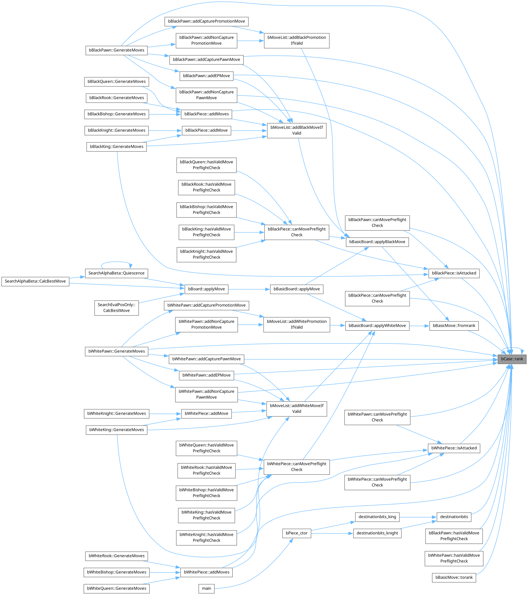 Referenced by bBlackPawn::addCapturePawnMove(), bWhitePawn::addCapturePawnMove(), bBlackPawn::addEPMove(), bWhitePawn::addEPMove(), bBlackPiece::addMoves(), bWhitePiece::addMoves(), bBlackPawn::addNonCapturePawnMove(), bWhitePawn::addNonCapturePawnMove(), bBlackPawn::canMovePreflightCheck(), bBlackPiece::canMovePreflightCheck(), bWhitePawn::canMovePreflightCheck(), bWhitePiece::canMovePreflightCheck(), destinationbits(), bBasicMove::fromrank(), bBlackPawn::GenerateMoves(), bWhitePawn::GenerateMoves(), bBlackPawn::hasValidMovePreflightCheck(), bWhitePawn::hasValidMovePreflightCheck(), bBlackPiece::isAttacked(), bWhitePiece::isAttacked(), rank(), and bBasicMove::torank().